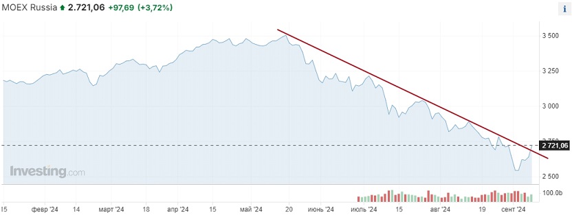Вчера индекс Мосбиржи пробил верхнюю границу нисходящего тренда, отыграв с минимумов 3 сентября порядка 200 пунктов из 1000, на которые индикатор падал с майских максимумов. При этом собственно пробой оказался весьма скромным. Полагаем, что для слома нисходящего тренда необходимо дополнительное подтверждение, хотя бы выход индекса в район 2750 пунктов.