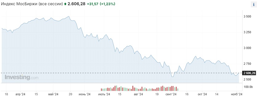 Сценарий разворота вверх на текущий момент, по нашему мнению, маловероятен, требуется дополнительное подтверждение. В качестве такого подтверждения может выступить выкуп падения после заседания Банка России 25 октября, по итогам которого была существенно ужесточена монетарная политика, а для этого индикатор должен вернуться выше 2700 пунктов, где он находился до оглашения итогов заседания.