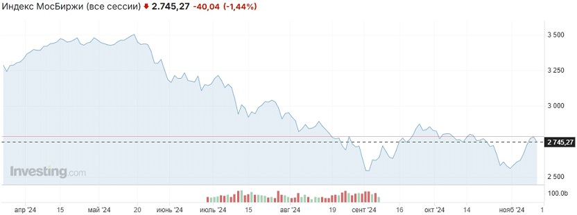Ноябрьское ралли на российскои рынке акций вчера прервалось коррекцией, индекс Мосбиржи на вечерке потерял около 1,5% и закрылся ниже 2750 пунктов. Основными причинами коррекции видим явную перекупленности рынка после семи сессий непрерывного роста и неудачного тестирования сопротивления 2800 пунктов в понедельник.