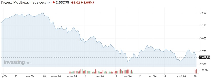 В лидерах падения среди более-менее ликвидных бумаг оказались акции МТС (-4,9%), префы Транснефти (-4,66%) и бумаги МКБ (-4,52%), тяжеловесы Газпром и Сбер потеряли 2,81% и 3,27% соответственно. Торговые обороты продолжили расти и значительно превысили типовые показатели.