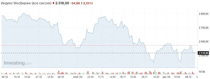 Сегодня ожидаем новых попыток снижения умеренными темпами и тестирования рубежа 2500 пунктов в качестве поддержки. На стороне продавцов по-прежнему будут выступать ожидания ужесточения монетарной политики Банком России на заседании 20 декабря, геополитический и санкционный факторы.
