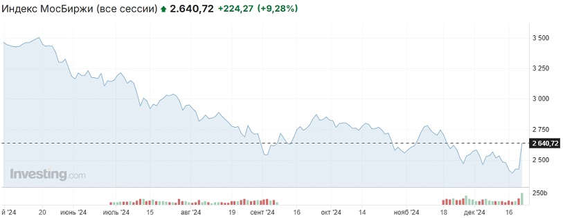Наши предположения относительно характера торгов пятницы на российском фондовом рынке в целом подтвердились. Индекс Мосбиржи открылся вблизи уровней закрытия вечерки четверга и первую часть дня двигался в районе 2430-2450 пунктов с попытками роста. После обнародования итогов заседания Банка России начался настоящий банкет, индикатор буквально взлетел к звездам, прибавив более 200 пунктов, протыкал вверх отметку 2650 пунктов, откуда немного отступил вниз и закрыл день на отметке 2638,42 пункта (+9,19%). На вечерке индекс в формате IMOEX2 прибавил пару пунктов (+9,28%, 2640,72 пункта).