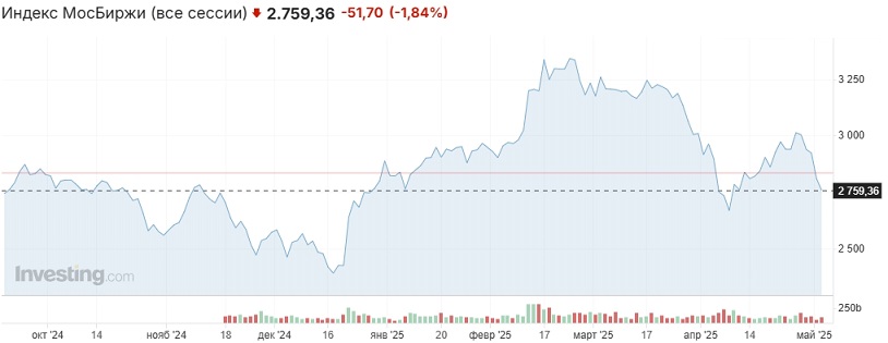 Вчера нисходящий тренд на российском рынке продолжился, индекс Мосбиржи закрыл снижением 5-ю сессию кряду, от максимума конца апреля индикатор отошёл более чем на 9%. Основное влияние на динамику российского рынка продолжают оказывать геополитический и санкционный факторы.