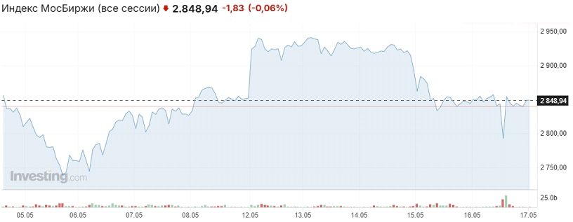На прошедшей неделе индекс Мосбиржи потерял символические 0,12% (с 2852,5 до 2848,94 пункта), то есть практически не изменился. Рост первой половины недели на предложении Путина о прямых переговорах между РФ и Украиной был распродан после обнародования состава участников российской делегации. Результаты переговоров привели к кратковременному всплеску волатильности, но в итоге индекс Мосбиржи остался в районе 2850 пунктов.