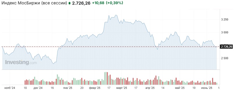 Наши предположения относительно колебаний российского фондового рынка в районе 2700 пунктов по индексу Мосбиржи в среду подтвердились частично, в отношении утренней части торгов. Индикатор опускался к отметке 2704 пунктов, откуда развернулся вверх, в ходе основной сессии двигался преимущественно в рамках диапазона 2720-2740 пунктов и закрыл день на отметке 2733,2 пункта (+0,4% к закрытию основной сессии вторника), а вечёрку - на отметке 2726,26 пункта (+0,39% к закрытию вечёрки вторника).