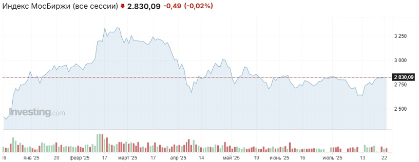 На геополитическом направлении значимых событий не происходило. Третий раунд переговоров делегаций РФ и Украины, как мы и ожидали, оказался абсолютно бессмысленным мероприятием, спектаклем для одного зрителя - Трампа. Более интересными были данные Росстата по инфляции: с 15 по 21 июля цены снизились на 0,05% (выросли на 0,02% неделей ранее), за 12 месяцев цены выросли на 9,17% (на 9,34% неделей ранее), с начала года - на 4,56%, с начала месяца — на 0,76%. При этом ни геополитический, ни монетарный факторы не вдохновили игроков на активные покупки.