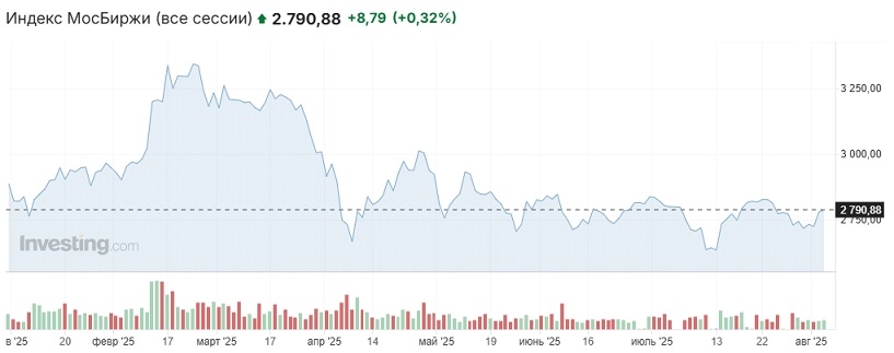 Сегодня торги на российском рынке по-прежнему будут проходить под знаком дедлайна, назначенного Трампом на 8 августа, а поездка Виткоффа (Витька) в Москву вряд ли что-то изменит, хотя не исключены неожиданности, например, в форме предложения со стороны РФ воздушного перемирия. Ожидаем тестирования рубежа 2800 пунктов по индексу Мосбиржи в качестве ближайшего значимого сопротивления с последующим отступлением индикатора вниз.