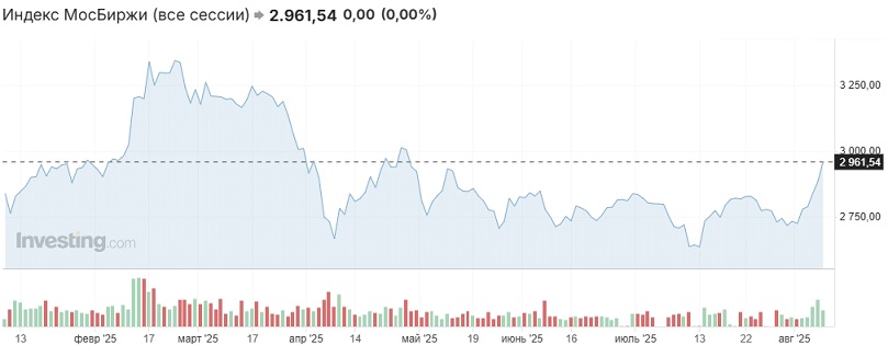 Российским рынком продолжила рулить геополитика. Многие игроки были воодушевлены сообщениями о назначенной на ближайшее время встречей Путина с Трампом, приступили к покупкам и загнали индекс Мосбиржи выше 2960 пунктов. На 15 августа назначена встреча Путина с Трампом на Аляске. Место встречи вызвало многочисленные шутки в мировом сообществе. Главным вопросоим встречи, согласно сообщениям некоторых СМИ, обозначен территориальный обмен, а именно, что РФ оставляет за собой в Украине, и что Украине возвращается. Зеленский отреагировал на эти сообщения, заявив, что "ответ на территориальный вопрос уже есть в Конституции Украины. Никто от этого не отступит и не сможет. Украинцы не отдадут свою землю".