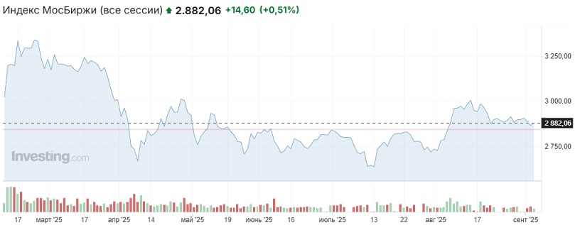 Наши предположения относительно колебаний российского рынка преимущественно в границах диапазона 2850-2880 пунктов по индексу Мосбиржи в среду полностью подтвердились. Индикатор двигался в рамках интервала 2847-2883 пункта, в начале основной сессии снова протестировал отметку 2850 пунктов в качестве поддержки, которая вновь устояла, после чего перешёл к росту. Основная сессия была закрыта на отметке 2867,55 пункта (+0,78% к закрытию основной сессии вторника). На вечерке индикатор прибавил ещё около 15 пунктов (2882,06 пункта, +0,51% к закрытию вечёрки вторника).