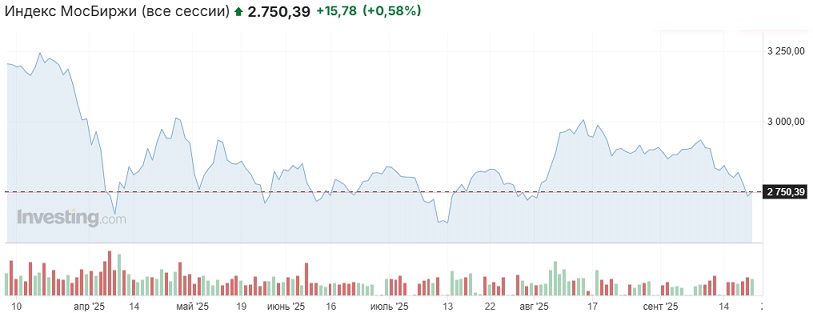 В понедельник российский рынок вырос. Попытки роста на утренней сессии быстро сошли на нет, в ходе основных торгов индикатор пикировал вниз и вплотную подходил к рубежу 2700 пунктов, переписав минимум с середины июля, но затем отскочил вверх. Основную сессию индекс закрыл на отметке 2741,06 пункта (-0,25% к закрытию основной сессии пятницы), вечёрку — на отметке 2750,39 пункта (+0,58% к закрытию вечёрки пятницы).