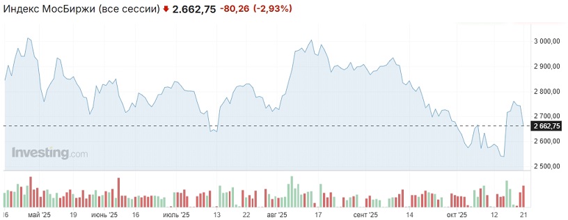 Во вторник российский рынок открылся утром существенным падением, затем перешёл в боковик, индекс Мосбиржи колебался вокруг 2700 пунктов, а во второй половине дня снижение возобновилось, и ближе к вечеру резко ускорилось, индикатор падал в район 2608 пунктов, откуда отскочил. Основная сессия была закрыта на отметке 2632,42 пункта (-4,1% к закрытию основной сессии понедельника). На вечёрке индекс отыграл ещё 30 пунктов (2662,75 пункта, -2,93% к закрытию вечёрки понедельника).
