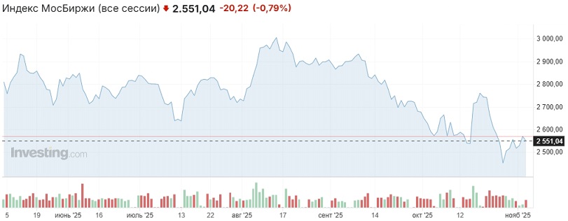 В среду российский рынок снизился, индекс Мосбиржи потерял около 0,8% и закрылся в районе 2550 пунктов