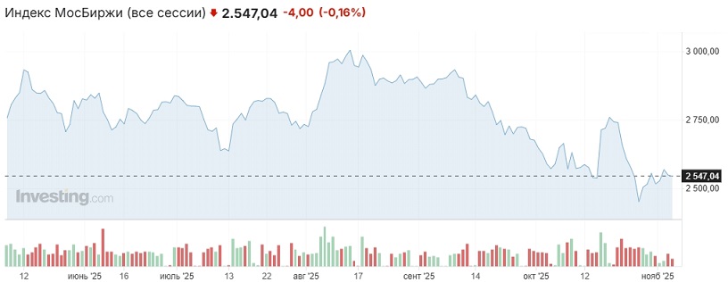 В четверг российский рынок немного снизился, индекс Мосбиржи закрылся чуть ниже 2550 пунктов