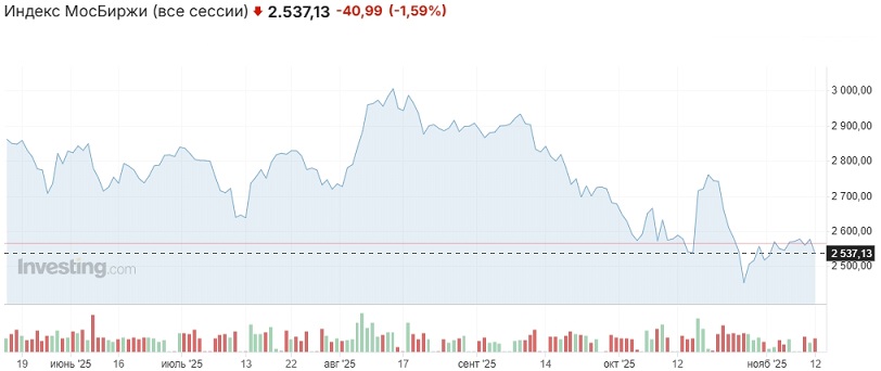 В среду индекс Мосбиржи переместился из верхней части диапазона 2500-2600 пунктов в нижнюю