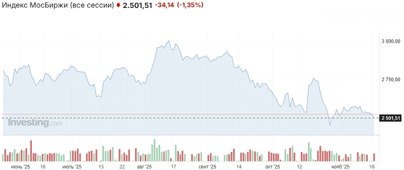 Индекс Мосбиржи в понедельник снизился на 1,35% и закрылся вблизи 2500 пунктов