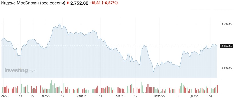 (дополнение от 21.12.2025): На торгах выходного дня в субботу российский рынок остался практически при своих относительно закрытия вечёрки пятницы, индекс Мосбиржи закрылся на отметке 2752,85 пункта. В всокресенье индикатор потерял порядка 3 пунктов (2749,72 пункта).