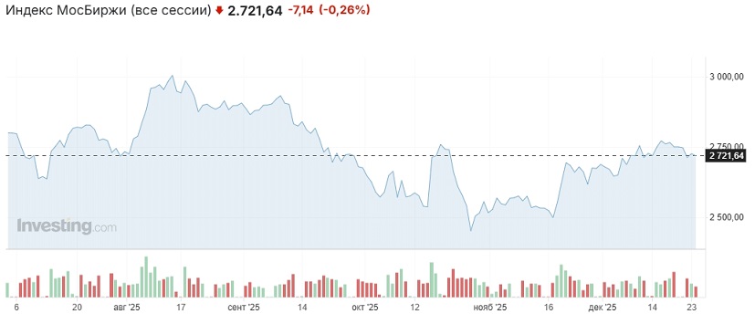Одним из ключевых факторов влияния на динамику российского рынка по-прежнему остаётся геополитика. Зеленский раскрыл 20 пунктов обсуждаемого с США "мирного плана Трампа". В свою очередь Москва должна ознакомиться с этим вариантом плана, соответствующую информацию Витьков и Кушнер должны были довести до Дмитриева, а тот в свою очередь — доложить Кремлю. На этом фоне индекс Мосбиржи снизился в район 2710 пунктов, но быстро отыграл потери.