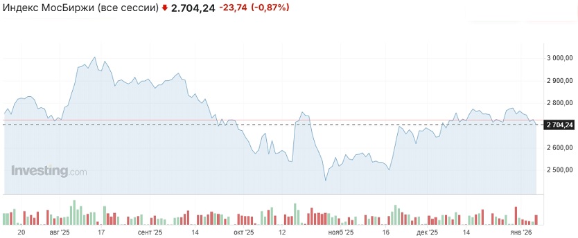 В первый полноценный торговый день года российский рынок снизился, но сумел удержаться выше 2700 пунктов по индексу Мосбиржи