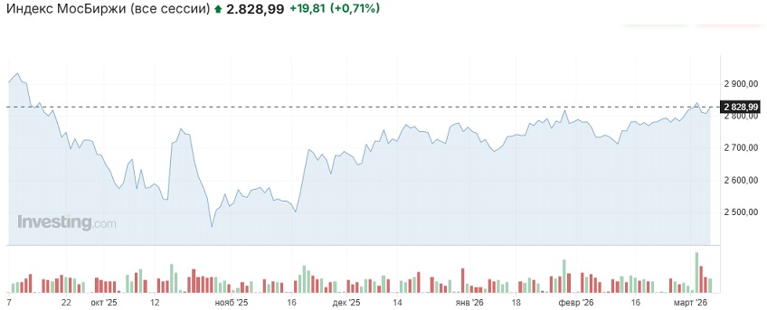 На торгах четверга российский рынок вырос и провел большую часть времени в колебаниях в районе 2820 пунктов, немного прибавив к вечеру. Основная сессия была закрыта на отметке 2825 пунктов (+0,54% к закрытию основной сессии среды), вечёрка — на отметке 2828,99 пункта (+0,71% к закрытию вечёрки среды).
