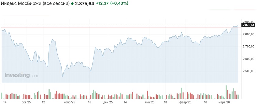 Наши предположения отнсительно попыток роста российского рынка в четверг в целом подтвердились. На утренней сессии индекс Мосбиржи ненадолго забирался выше 2880 пунктов, затем отступил вниз, а ближе к вечеру выходил выше 2870 пунктов. Основная сессия была закрыта на отметке 2872,08 пункта (+0,63% к закрытию основной сессии среды), вечёрка — на отметке 2875,64 пункта (+0,43% к закрытию вечёрки среды).