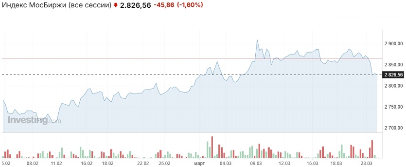 Вчера российский рынок снизился, индекс Мосбиржи пробил вниз поддержку 2840-2850 пунктов и закрылся в районе 2826 пунктов (-1,6% к закрытию пятницы). Такую динамику спровоцировало резкое снижение нефтяных котировок на фоне сообщений о переговорах США с Ираном относительно прекращении войны. Также продавцов поддержал продолживший заметно укрепляться рубль.