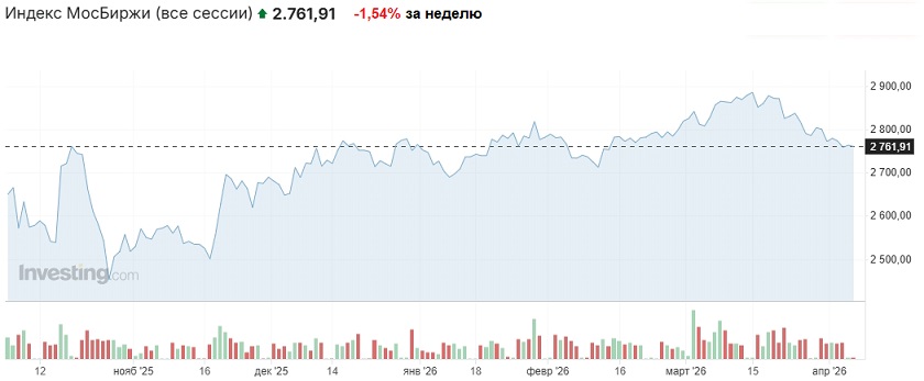 (дополнение от 05.04.2026): торги выходного дня в воскресенье индекс Мосбиржи закрыл на отметке 2761,91 пункта (+0,04% к закрытию основной сессии пятницы).
