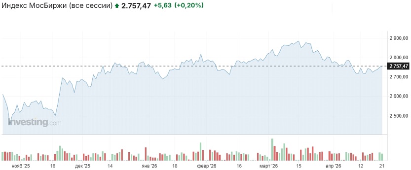 Наши предположения об отсутствии весомых оснований для выхода российского рынка вверх из консолидации подтвердились в отношении первой половины торгов вторника. Индекс Мосбиржи после открытия торгов не удержался выше отметки 2750 пунктов и днём двигался ниже неё, плавно сползая вниз до 2737 пунктов, однако ближе к вечеру резко пошёл в рост и отыграл все потери. Основная сессия была закрыта на отметке 2757,7 пункта (+0,15% к закрытию основной сессии понедельника), вечёрка — на отметке 2757,47 пункта (+0,2% к закрытию вечёрки понедельника).