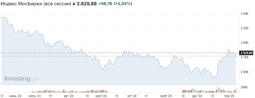 После предновогоднего ралли на решении ЦБ РФ оставить ключевую ставку на уровне 21% годовых индекс Мосбиржи в первые сессии наступившего года опустился ниже закрытия года минувшего (2883,04 пункта) и двигался преимущественно в рамках диапазона 2750-2850 пунктов, закрытие пятницы прошло вблизи отметки 2830 пунктов.