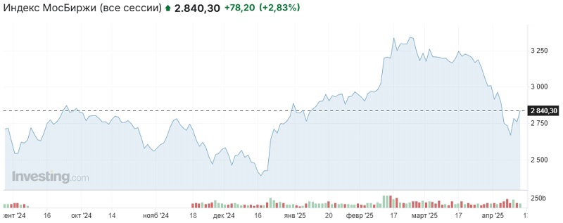 На очередной торговой неделе рост может получить продолжение. Мы не разделяем эйфории, связанной с переговорами между РФ и США, считаем, что миротворческая миссия Трампа невыполнима, и полагаем, что если рост и будет, то умеренным, а настроения игроков могут резко поменяться при выходе значимых новостей, в том числе с геополитического направления. (дополнение от 14.04.2025): Утренняя сессия понедельника на российском рынке открылась ростом, индекс Мосбиржи двигался в районе 2860-2880 пунктов, после открытия основных торгов индикатор отполз ниже.