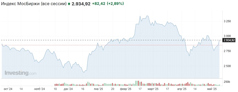 Тяжеловесы российского рынка показали следующие результаты: Газпром +2,68%, ЛУКОЙЛ +№,67%, Норникель +2,6%, Роснефть +2,82%, Сбер +2,87%, Сургутнефтегаз +1,9%. В лидерах роста среди более-менее ликвидных бумаг оказались МКБ +7,2%, ПИК +6% и ВК +4,21%. Торговые обороты выросли по сравнению с четвергом, но остались ниже типовых показателей. Рост происходил на фоне предложения Путина Украине, которое он сделал в ночь с 10 на 11 мая, возобновить прямые переговоры без предварительных условий в Стамбуле, начиная с 15 мая, что многими игроками было воспринято в бычьем ключе.