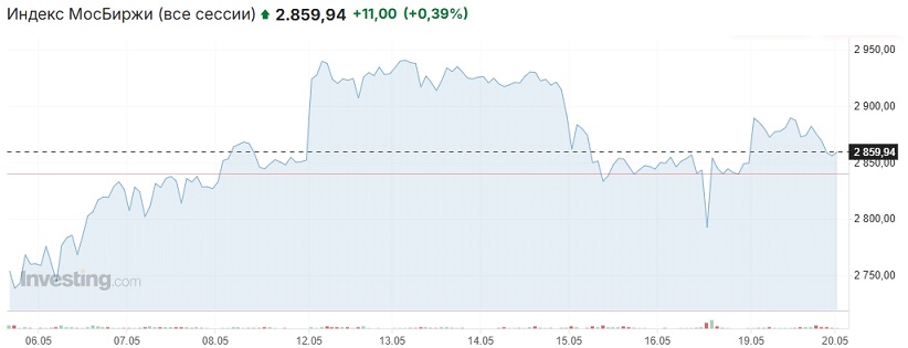 Российский фондовый рынок в понедельник открылся гэпом вверх, отрабатывая итоги торгов субботы и воскресенья, и основную часть дня двигался в боковике в районе 2880 пунктов по индексу Мосбиржи. Закрытие дня прошло на отметке 2882,63 пункта (+1,49% к закрытию дня пятницы). На вечерке картина изменилась: индикатор пошёл на снижение, в моменте терял более 30 пунктов и опускался в район 2850 пунктов, откуда немного отскочил вверх (2859,94, +0,39% к закрытию вечерки пятницы).