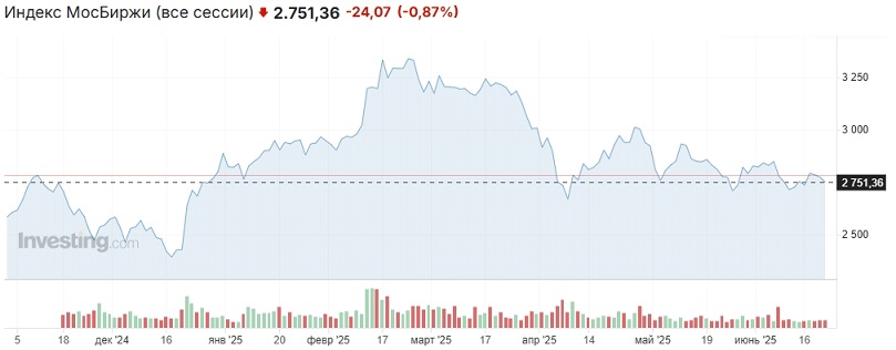 (дополнение от 23.06.2025): Утром понедельника индекс Мосбиржи в формате IMOEX2 открылся ростом в районе 2770 пунктов, ключевые биржи АТР демонстрируют смешанную, большей частью понижательную динамику, фьючи на основные индексы Европы и США снижаются, сентябрьский фьюч на Brent торгуется в районе $76,8 за баррель.