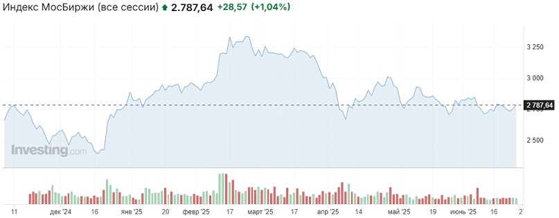 Вчера российский рынок продолжил восходящее движение в диапазоне 2700-2800 пунктов по индексу Мосбиржи и закрылся недалеко от его верхней границы. Индикатор движется в указанном диапазоне с 6 июня, причём в последнее время объёмы сделок заметно снизились.