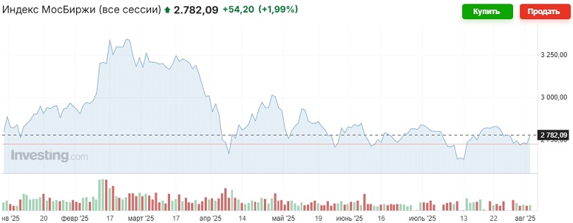 Сегодна продолжение роста по инерции возможно, но, скорее всего, он будет умеренным и кратковременным. Торги по-прежнему будут проходить под знаком дедлайна, назначенного Трампом на 8 августа, а поздка Виткоффа (Витька) в Москву вряд ли что-то изменит. Пробой вверх рубежа 2800 пунктов считаем маловероятным, отдаём предпочтение сценарию отката вниз.