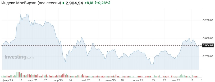 (дополнение от 25.08.2025): В воскресенье индекс Мосбиржи вернулся ниже 2900 пунктов (2894,16 пункта, -0,09% к закрытию основной сессии пятницы). Утром понедельника ключевые биржи АТР растут, фьючи на основные индексы Европы и США большей частью в минусе, октябрьский фьюч на Brent торгуется в районе $67,24 за баррель.