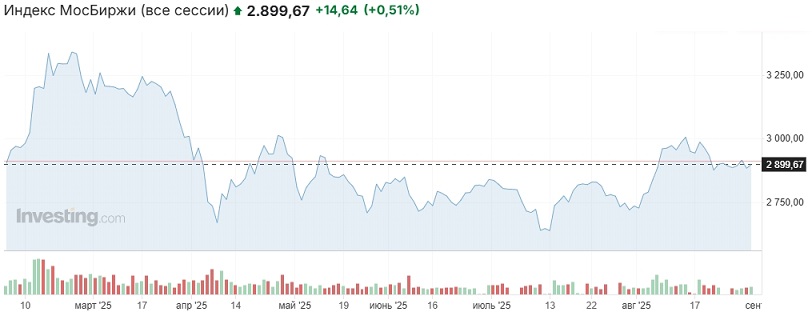 (дополнение от 01.09.2025): Дополнительные торги выходного дня в воскресенье индекс Мосбиржи закрыл на отметке 2907,14 пункта (+0,27% к закрытию основной сессии пятницы). Утром понедельника в АТР ведущие индикаторы большей частью снижаются, фьючи на основные индексы Европы и США преимущественно в плюсе около нуля, октябрьский фьюч на Brent немного дешевеет и торгуется в районе $67,25 за баррель.