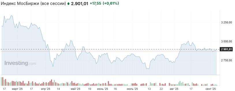 (дополнение от 08.09.2025): Дополнительные торги в воскресенье индекс Мосбиржи закрыл на отметке 2906,1 пункта (+0,16% к закрытию основной сессии пятницы). Утром понедельника в АТР ведущие площадки демонстрируют смешанную динамику, фьючи на основные индексы Европы и США преимущественно умеренно растут, ноябрьский фьюч на Brent дорожает более чем на 1% и торгуется в районе $66,3 за баррель.