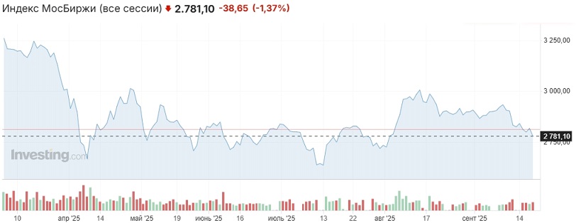 Наши ожидания относительно консолидации российского рынка вблизи 2820 пунктов по индексу Мосбиржи на торгах четверга не оправдались. Попытки удержаться в районе указанной отметки наблюдались лишь на старте утренней сессии, но они оказались неудачными. Ближе к вечеру индикатор переписал минимум с начала августа в районе 2775 пунктов, основная сессия была закрыта на отметке 2793,58 пункта (-0,73% к закрытию основной сессии среды), вечёрка — на отметке 2781,10 пунктов (-1,37% к закрытию вечёрки среды).
