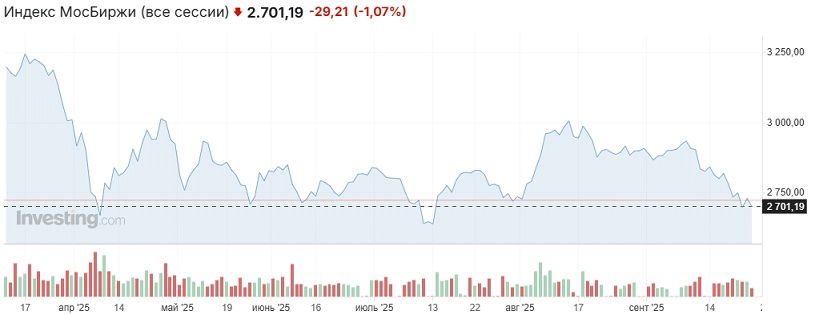 Вчера российский рынок снизился после предшествующего отскока, индекс Мосбиржи прокалывал вниз рубеж 2700 пунктов и закрылся чуть выше него, при этом двухмесячный минимум, установленный позавчера в районе 2675 пунктов, переписан не был. На стороне продавцов играли геополитический и монетарный факторы. Нисходящий тренд пока остаётся в силе, но его темпы замедлились.