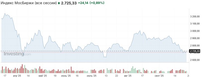 (дополнение от 29.09.2025): Воскресные торги на Мосбиржи закончились небольшим снижением российского рынка до 2721,83 пункта по индексу Мосбиржи (-0,15% относительно закрытия основной сессии пятницы). Утром понедельника в АТР ведущие площадкипреимущественно растут, фьючи на основные индексы Европы и США в плюсе, декабрьский фьюч на Brent дешевеет и торгуется в районе $68,85 за баррель.