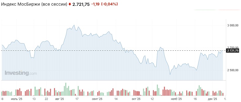 В среду российский рынок двигался в узком боковике в границах диапазона 2713-2731 п. по индексу Мосбиржи. Основная сессия была закрыта на отметке 2720,66 пункта (+0,66% к закрытию основной сессии вторника), вечёрка — на отметке 2720,66 пункта (-0,04% к закрытию вечёрки вторника).