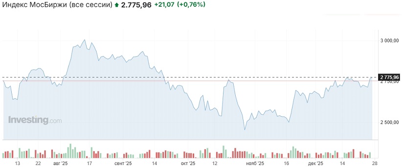 (дополнение от 28.12.2025): В воскресенье российский рынок закрылся на отметке 2779,31 пункта (+0,89% к закрытию основной сессии пятницы, +0,31% к закрытию вечёрки пятницы).