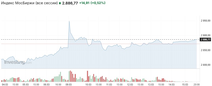 Прошедшую неделю российский рынок начал со взлёта до 2950 пунктов по индексу Мосбиржи на фоне кратковременного удорожания Brent до $120 за баррель, после чего вслед за нефтяными котировками отступил вниз и всю неделю двигался ниже указанной отметки. Индекс Мосбиржи в формате IMOEX2 прибавил 1% (с 2858,01 пункта в пятницу 6 марта до 2886,77 пункта в воскресенье 15 марта). Кроме сырьевого фактора на стороне покупателей играл валютный, а монетарный поддержал продавцов.