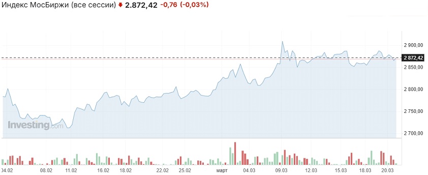 Прошедшую неделю российский рынок провёл в боковике, индекс Мосбиржи в формате IMOEX2 прибавил символические 0,08% (с 2870,2 пункта в пятницу 13 марта до 2872,42 пункта в пятницу 20 марта). Вероятно, ближневосточный драйв если не завершился, то по крайней мере временно утратил своё влияние. На стороне покупателей выступал слабевший рубль, продавцов поддерживал монетарный фактор, а также отсутствие позитива на украинском направлении, и в целом указанные обстоятельства уравновешивали друг друга.