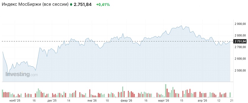 Утром понедельника российский рынок попытался продолжить рост выходных и вплотную подбирался к отметке 2750 пунктов по индексу Мосбиржи, откуда отполз вниз до 2728 пунктов, но затем, ближе к вечеру, заметно отскочил вверх. Основная сессия была закрыта на отметке 2753,66 пункта (+0,48% к закрытию воскресенья), вечёрка — на отметке 2751,84 пункта (+0,41% к закрытию воскресенья). Объёмы сделок оказались ниже средних значений, что не характерно для понедельников.